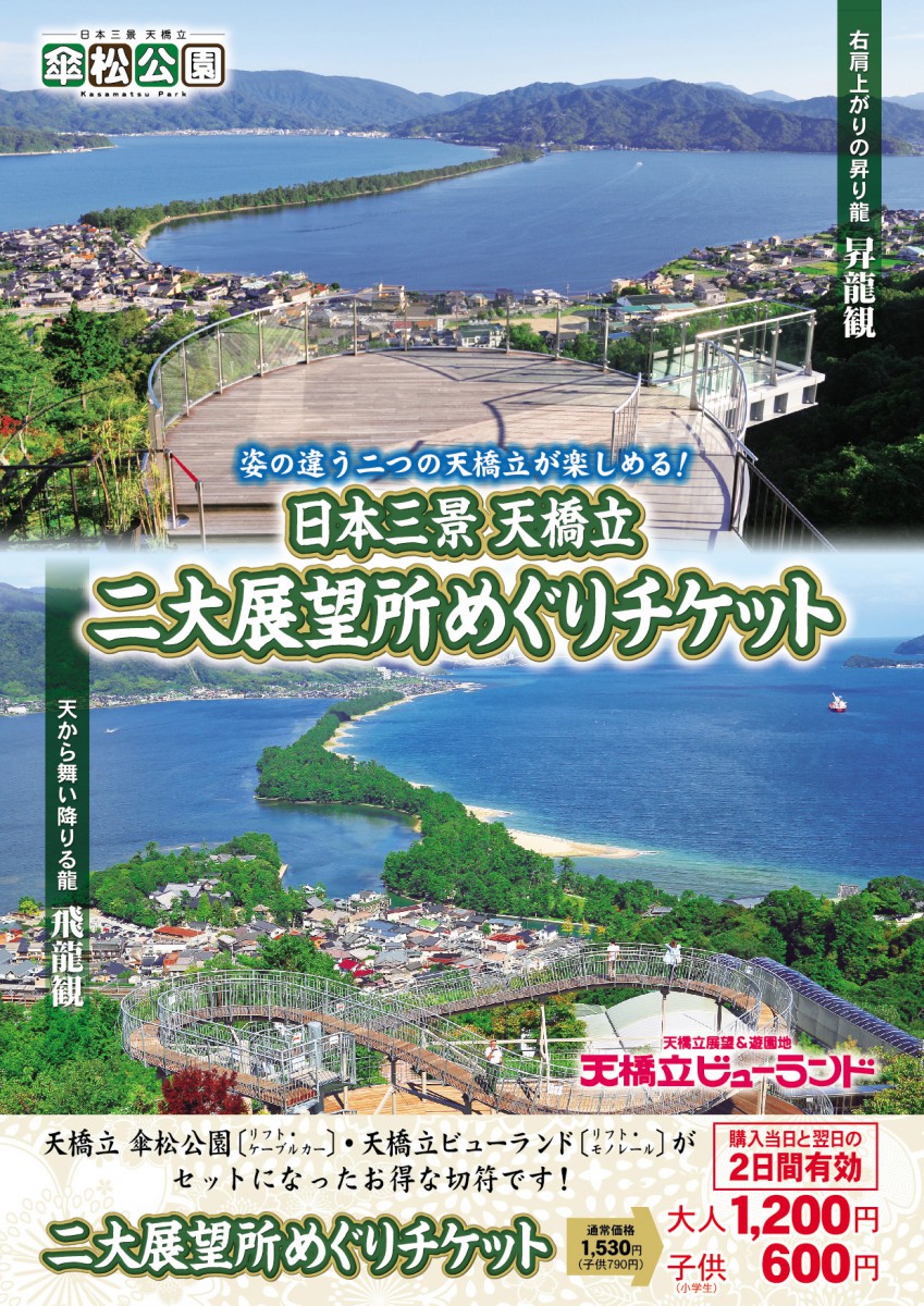 「天橋立ビューランド」と対岸の施設「傘松公園」とのセット券。日本三景天橋立の景観を南北から楽しむお得なチケットとなります。両施設をご利用出来るチケットは窓口でお買い求め下さい。